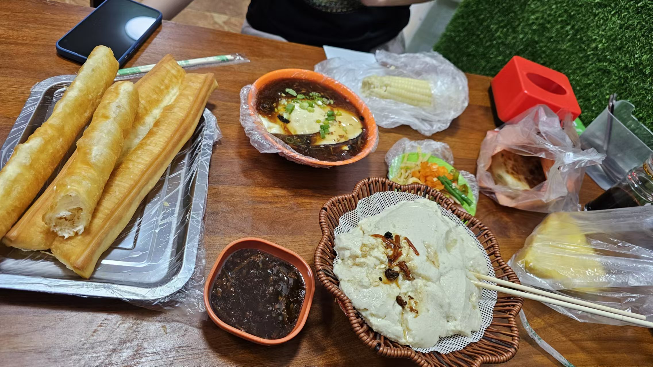 挤了半天买了点馅饼、玉米、粑粑这些我们俩感兴趣的小吃,找了家招牌打的是辽西老豆腐的早餐店开始整点早餐。除了油条吃着一般,其他的东西都非常的合我们胃口。